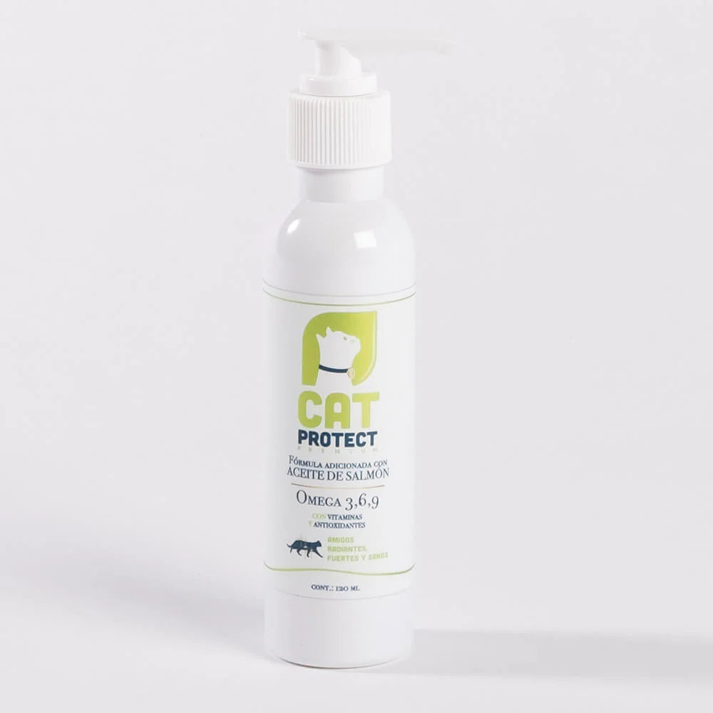 Cat protect aceite de salmón es un producto que ayuda a mejorar el sistema inmune y cardiovascular de tu mascota, con la mezcla perfecta de aceites vegetales y de salmón ayudará a que tu gato mejore su digestión, evite la caída del pelo, optimice su condición corporal para que crezca fuerte y bello.