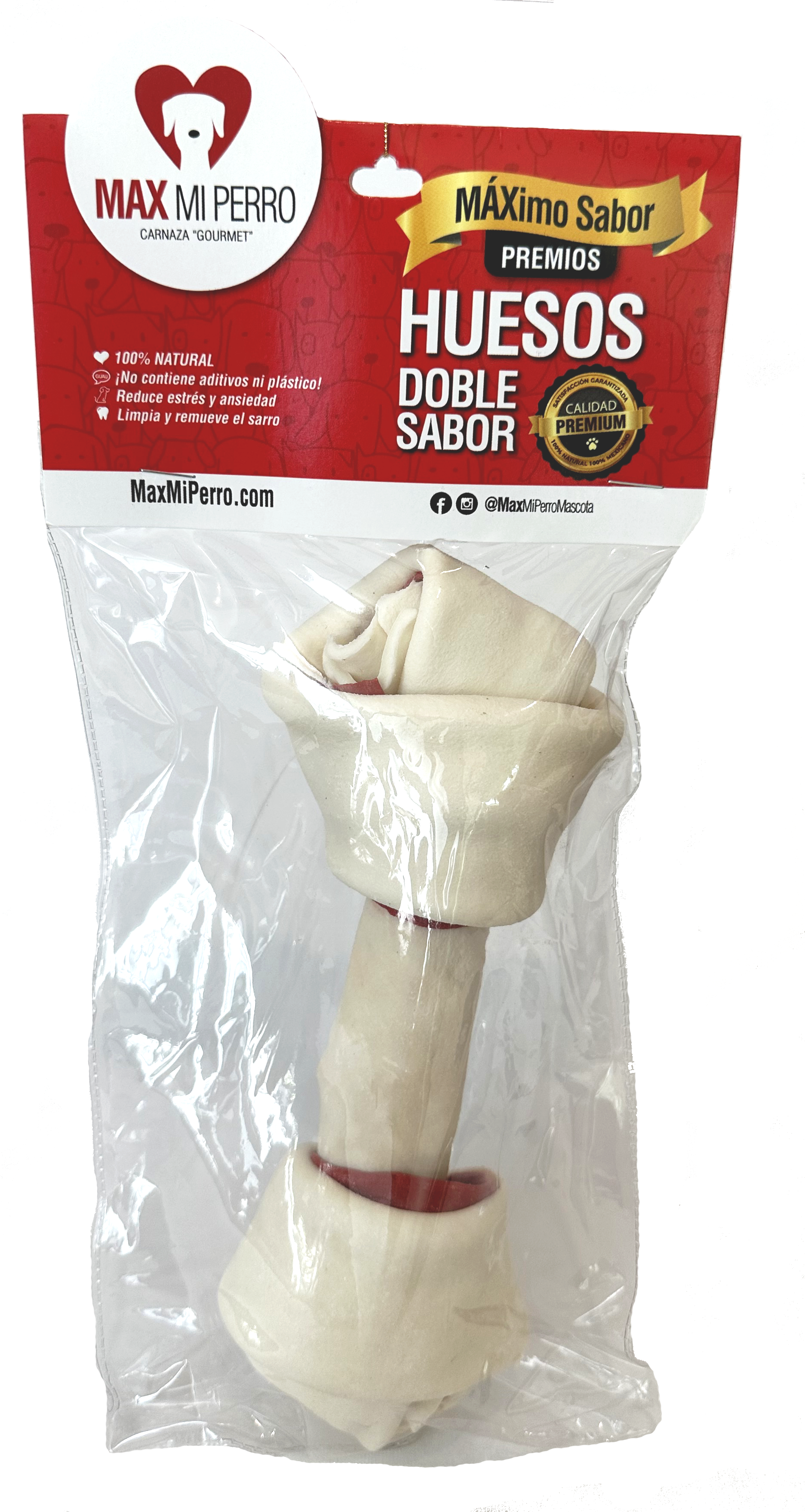 Hecho 100% de carnaza de res natural. Compuesto con dos tipos de carnaza, blanca (sabor natural) y roja (sabor tocino), esta última es flexible gracias a su innovador proceso de elaboración. Esto hace que nuestro peludo disfrute más y por mayor tiempo de una forma más segura.