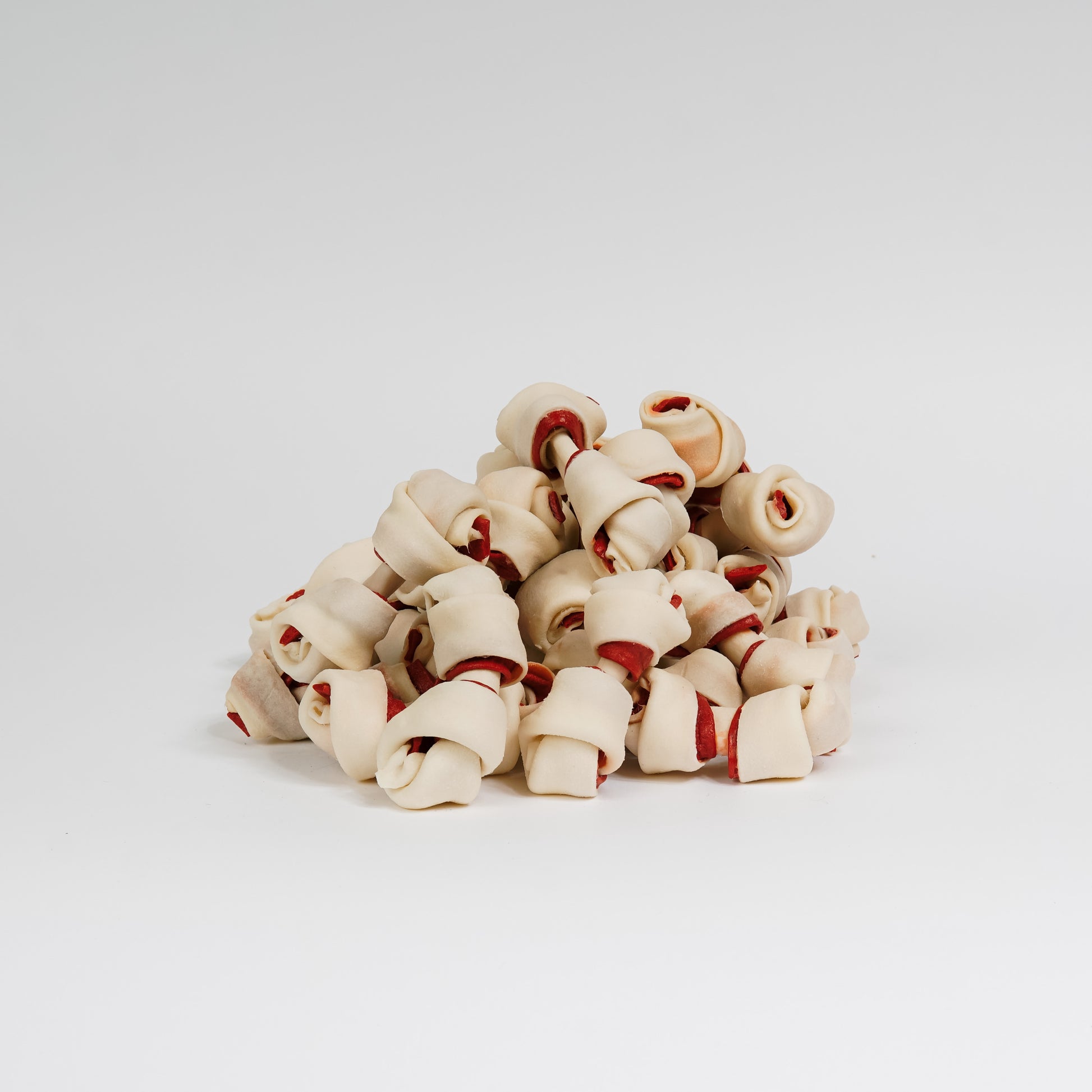 Hecho 100% de carnaza de res natural. Compuesto con dos tipos de carnaza, blanca (sabor natural) y roja (sabor tocino), esta última es flexible gracias a su innovador proceso de elaboración. Esto hace que nuestro peludo disfrute más y por mayor tiempo de una forma más segura.