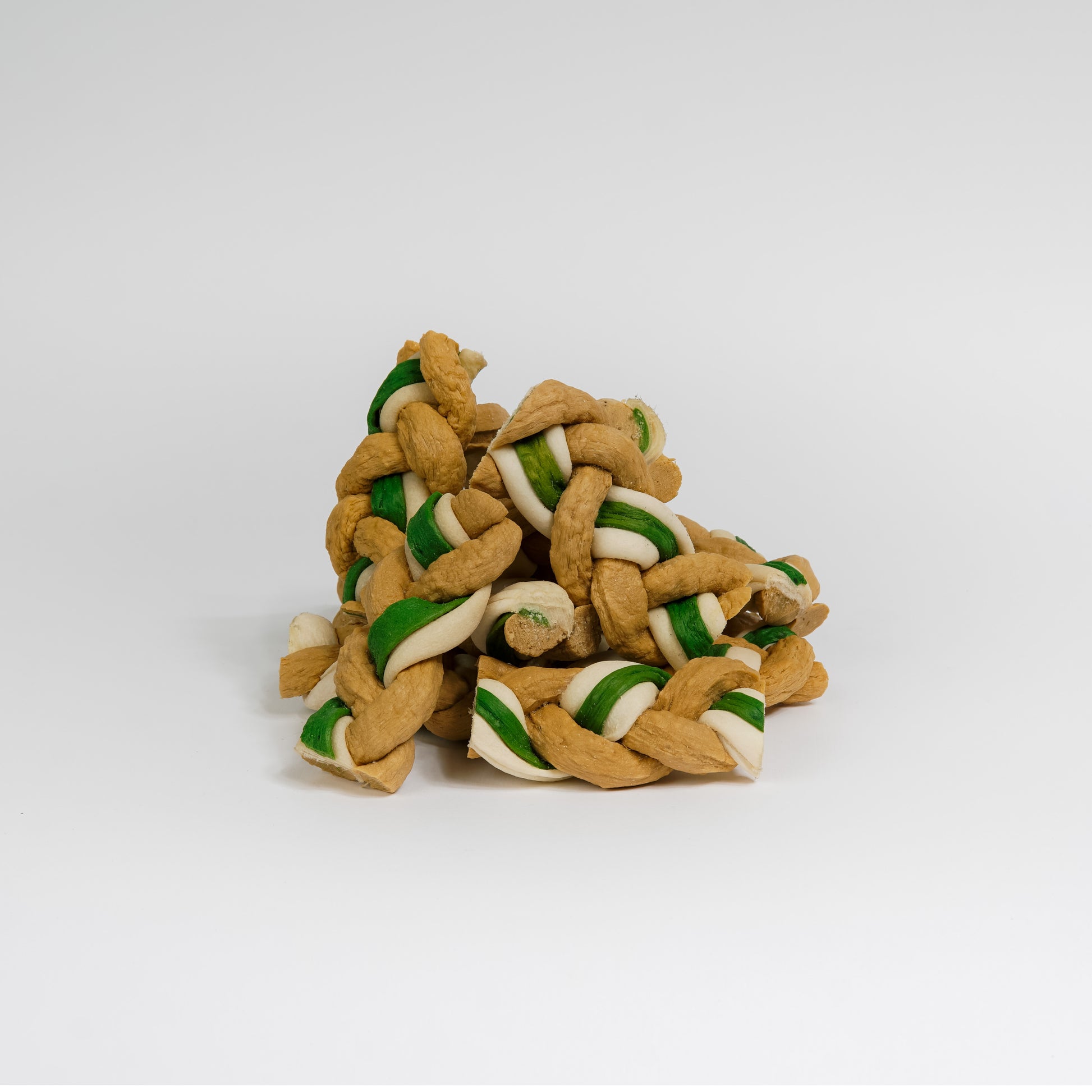 Hecho 100% de carnaza de res natural. Compuesto con tres tipos de carnaza, blanca (sabor natural), verde (sabor manzana) y café (sabor cacahuate), esta última es flexible gracias a su innovador proceso de elaboración. Esto hace que nuestro peludo disfrute más y por mayor tiempo de una forma más segura.